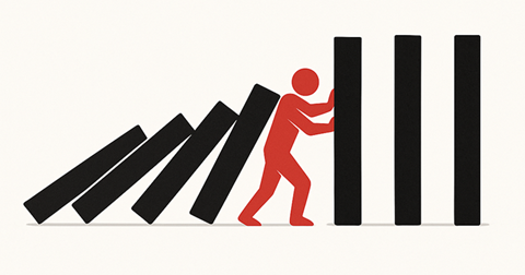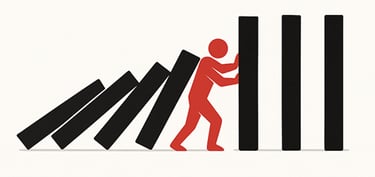 The standing dominoes represent what’s still holding — the parts of an organization that can stay steady if leaders understand what’s really pushing and pulling at them.